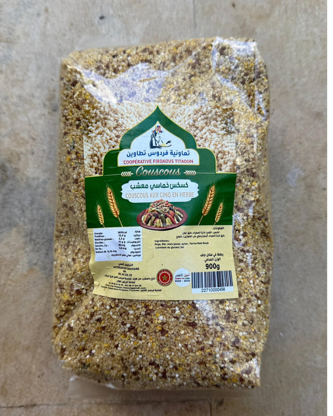 Couscous aux herbes, orge, blé, maïs jaune, ilane, maïs rouge, thym, sel.